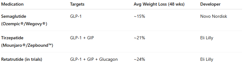 This incremental innovation — from single → dual → triple agonist — represents the natural evolution of the metabolic drug pipeline.